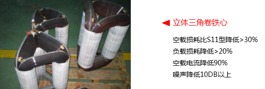 與目前國標的S11型配電變壓器相比,立體卷鐵心一級能效變壓器空載損耗降低30%以上,負載損耗降低20%以上,總損耗降低25%以上??蛰d電流和噪聲水平均大幅度降低。